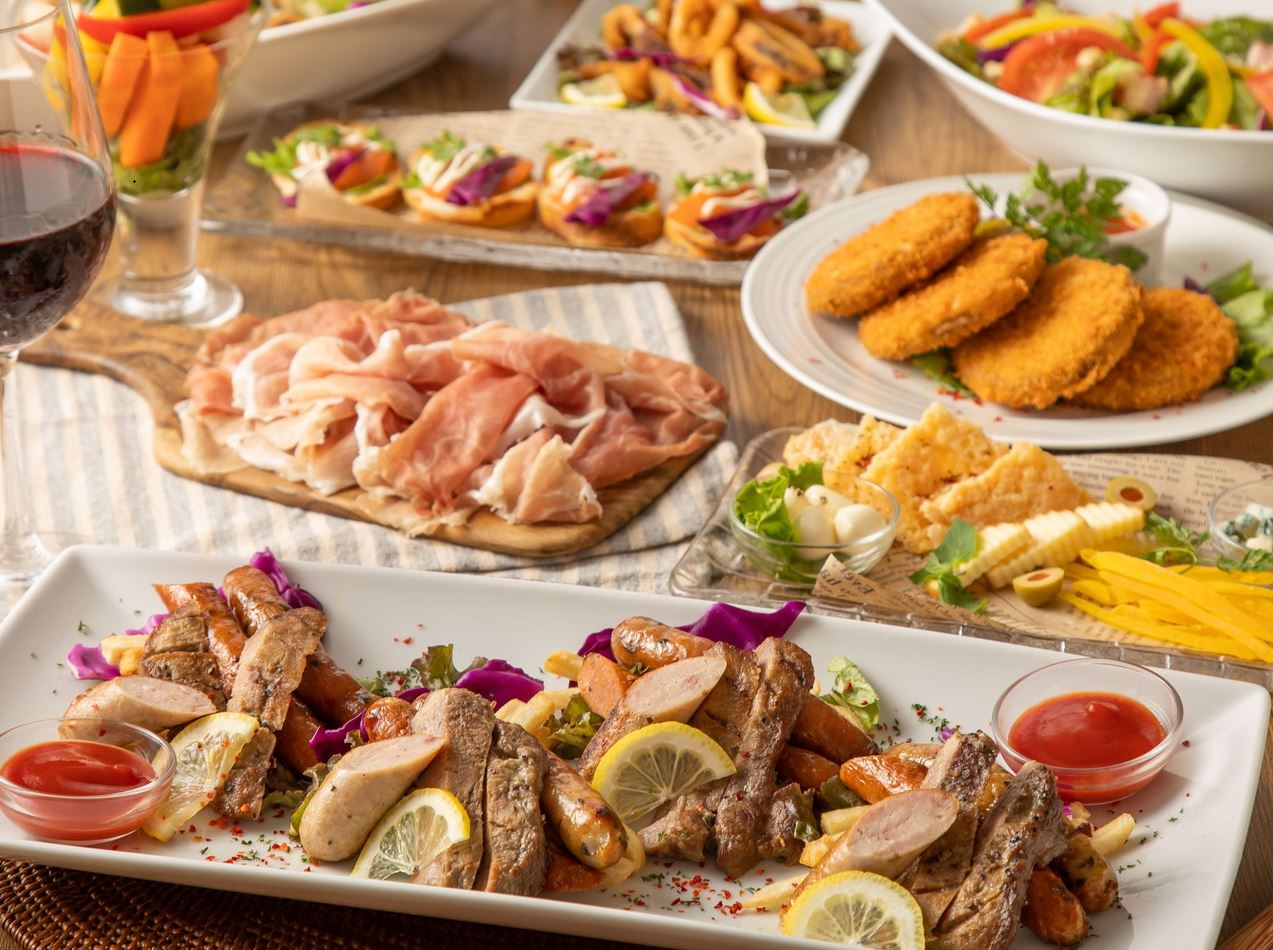 メインディッシュには、特選牛サガリのステーキをご用意しております。メインディッシュ以外にも、お酒がどんどんすすむ生ハムや揚げ物、お食事ものもご用意しております。