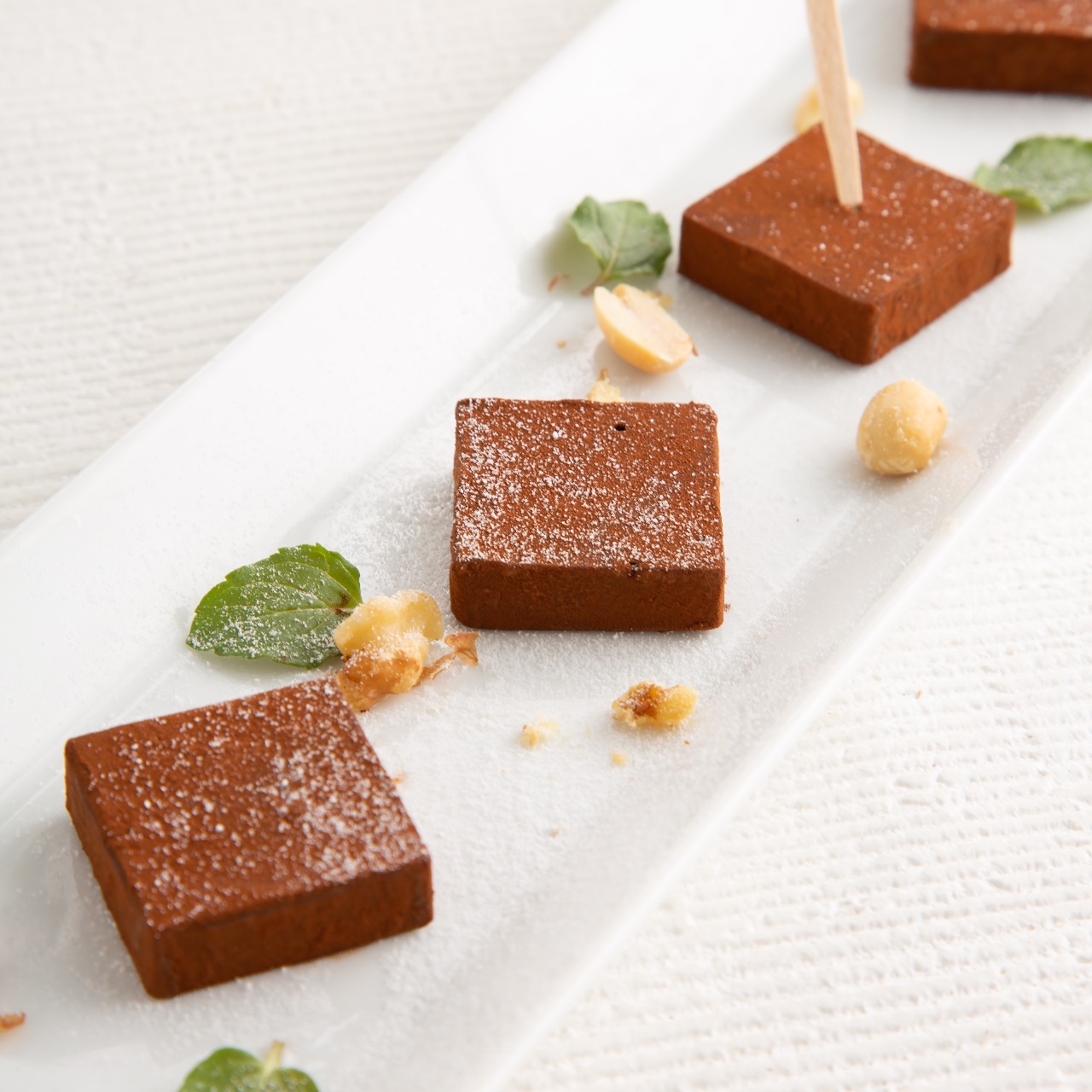 原材料にウイスキーを使用している生チョコレートです。口に入れるとゆっくりとほどけるように、じんわりととろけていく生チョコレートのなかに、濃厚なウイスキーならではの深みのある香りと味わいを感じることができますよ。ウイスキーやハイボールのお供としてご注文いただくことも多い一品です。上品な口どけをお楽しみください。803円(税込)でご提供しております。