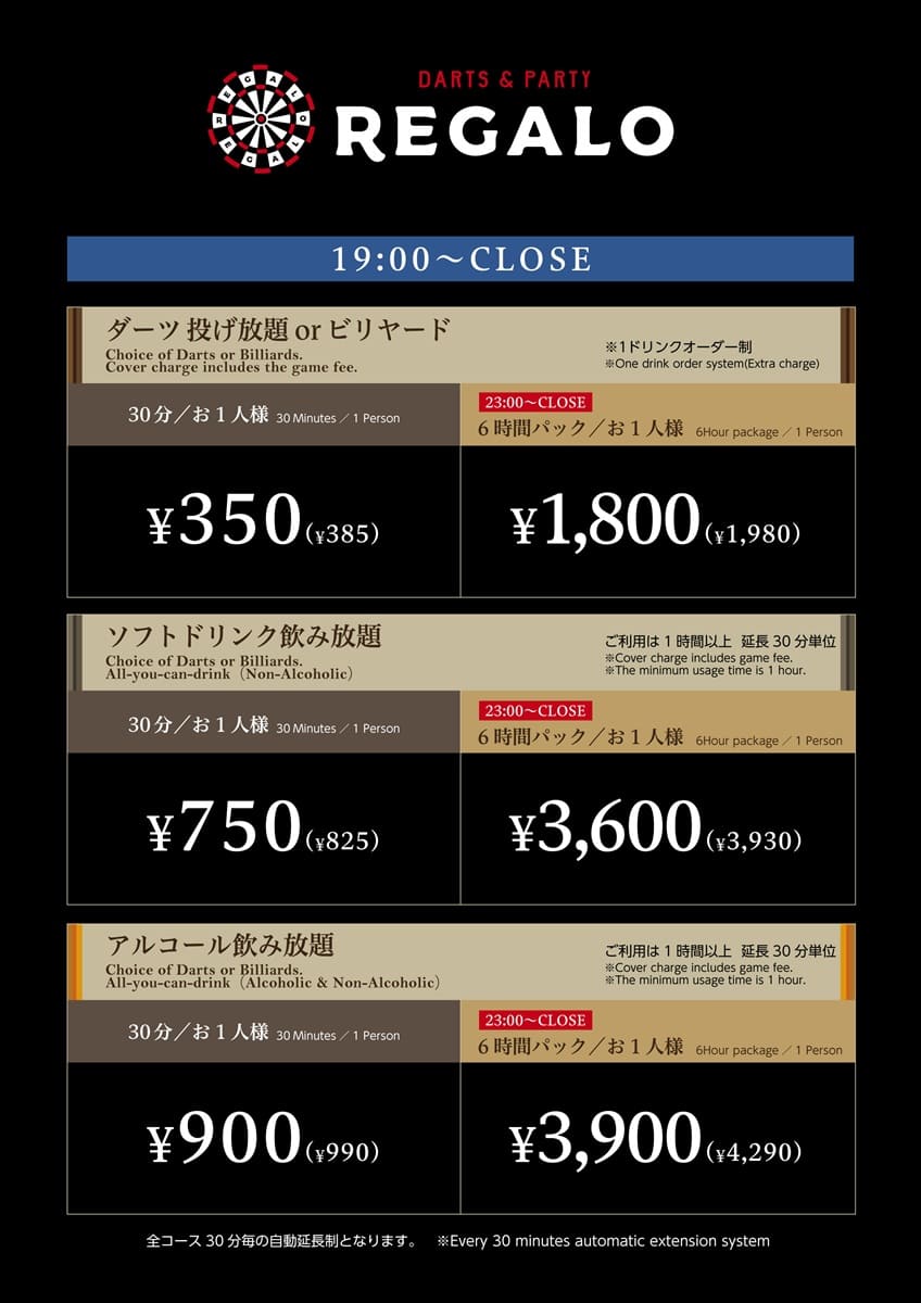 | ●ダーツ投げ放題(1ドリンク制) または ビリヤード(1ドリンク制) | 30分/お一人様 350円(税込) |