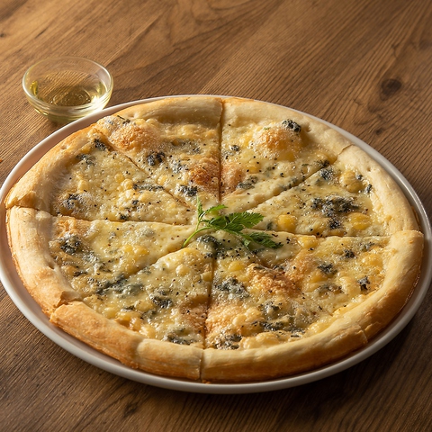ブルーチーズの一種であるゴルゴンゾーラを使ったピザです。ブルーチーズと聞くとクセが強そうなイメージがあるかもしれません、ゴルゴンゾーラはブルーチーズのなかでもクセが少ない部類に含まれるので、意外なほどに食べやすいですよ。ハチミツをたっぷりとかけて仕上げる甘いピザは本場イタリアでは定番中の定番。デザート代わりにもおすすめの一品です。1,375円(税込)でご提供しております。
